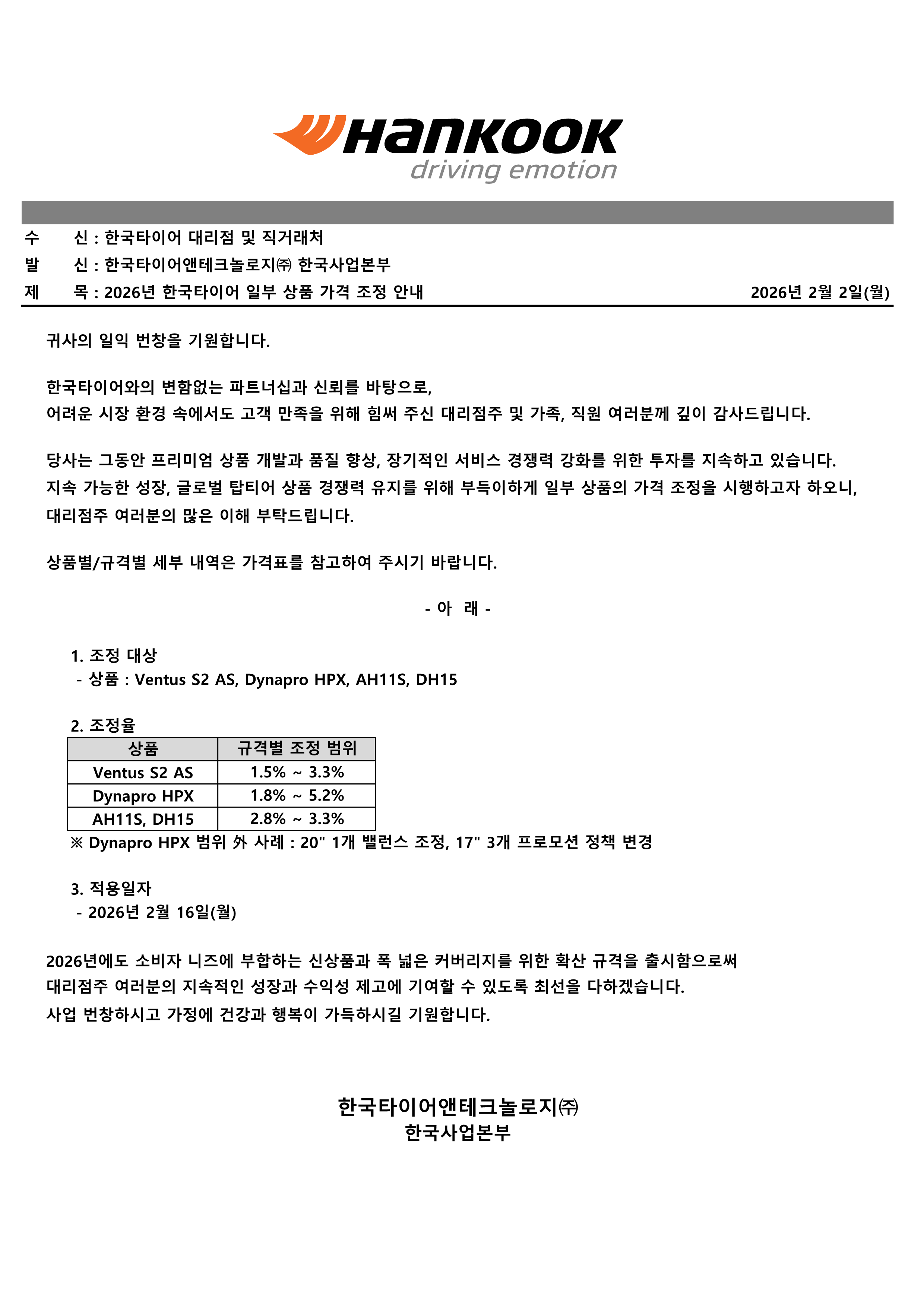 26.02.16 한국타이어 공장도 가격 인상 예정입니다.